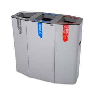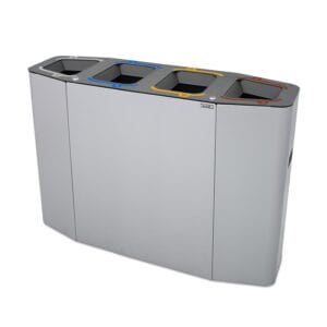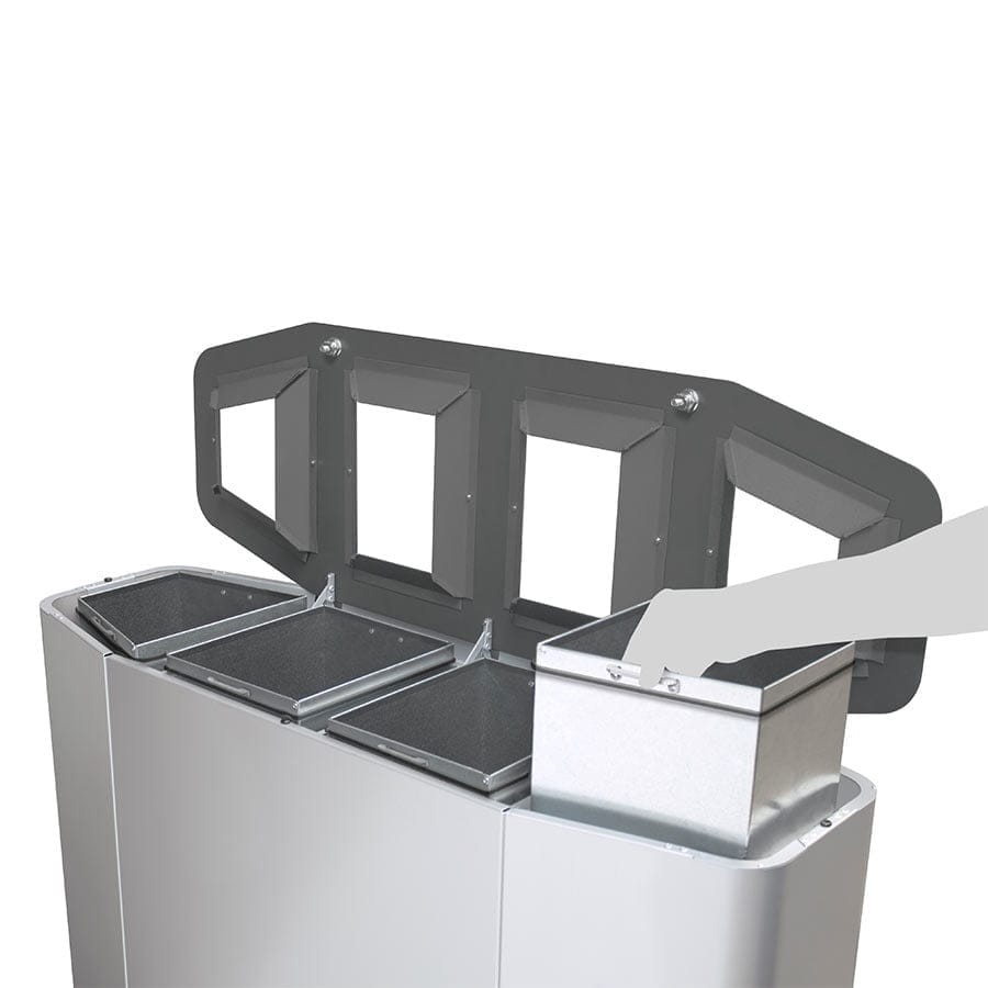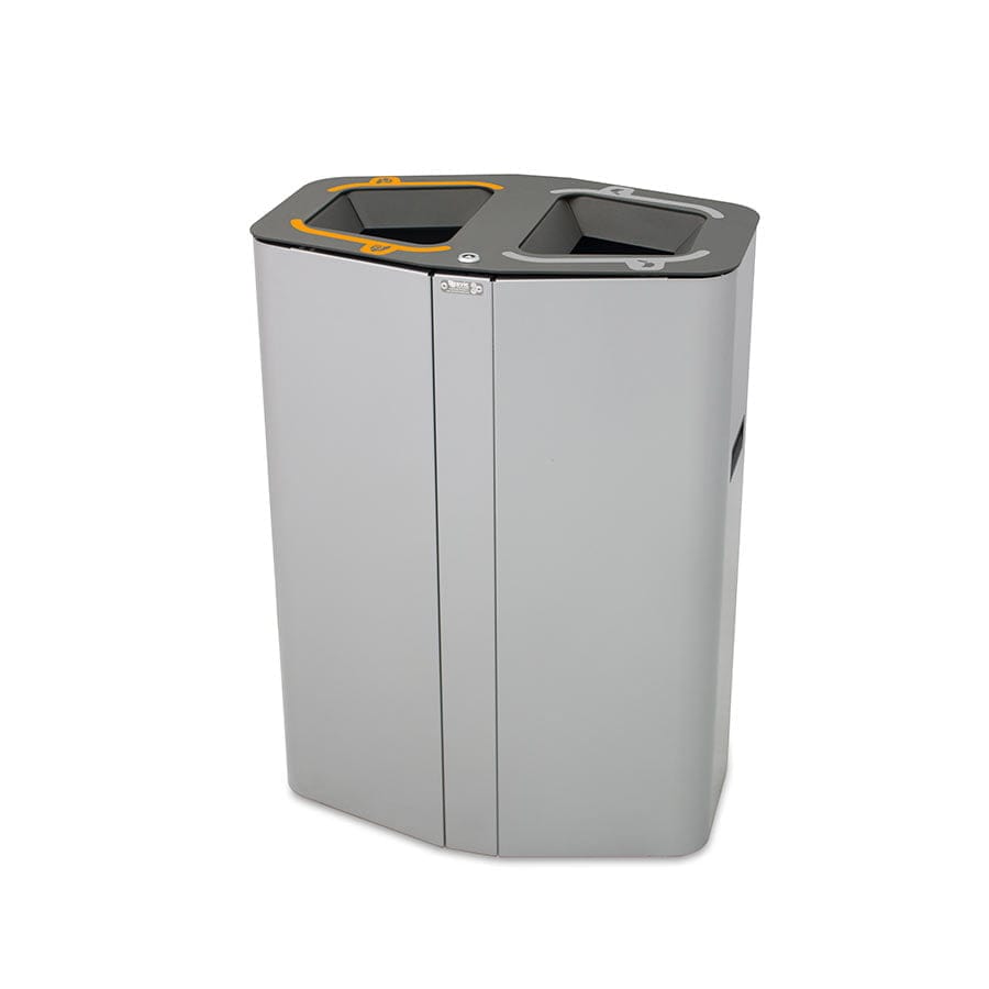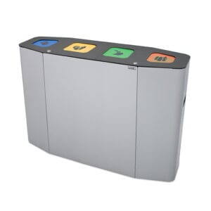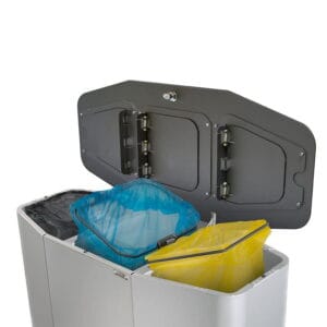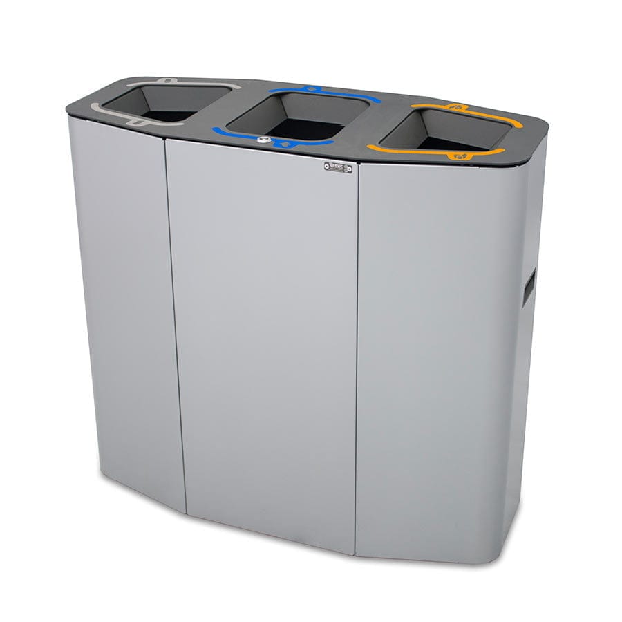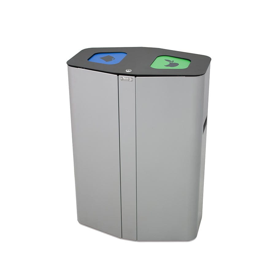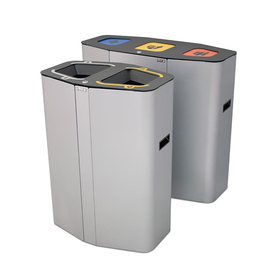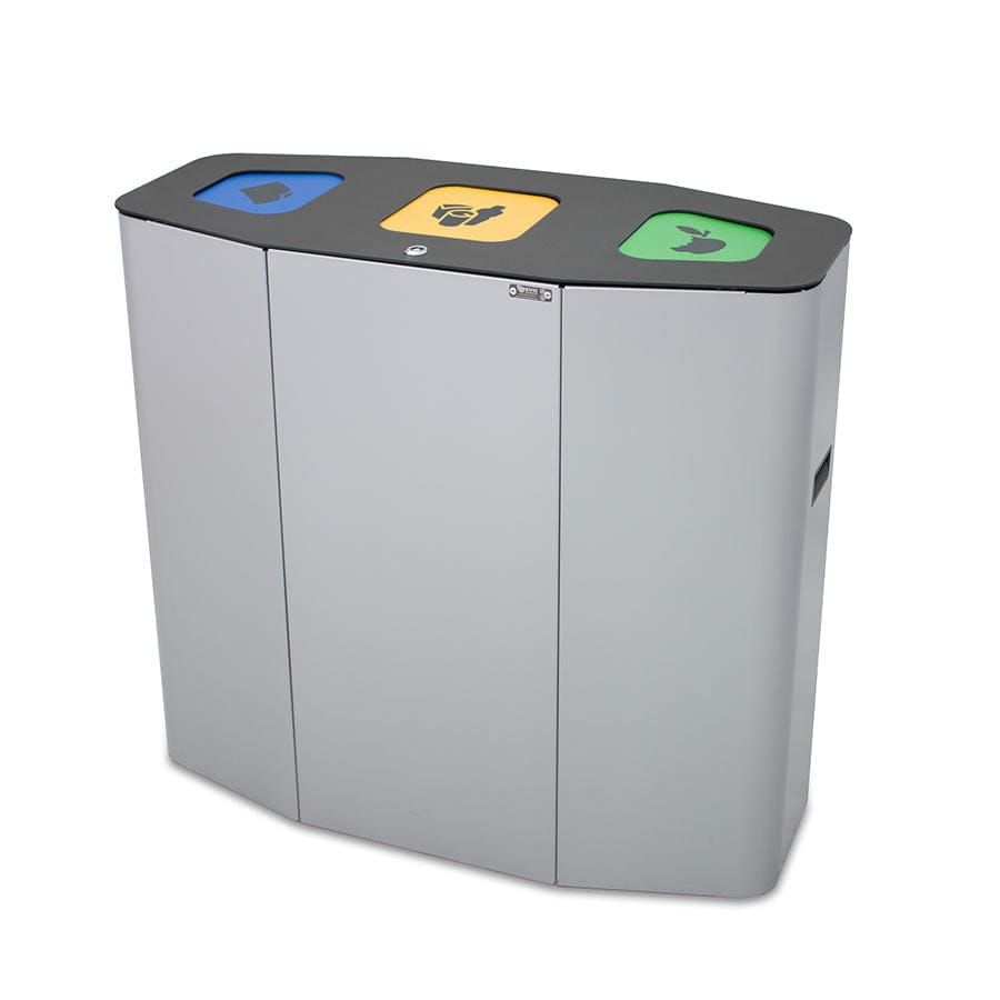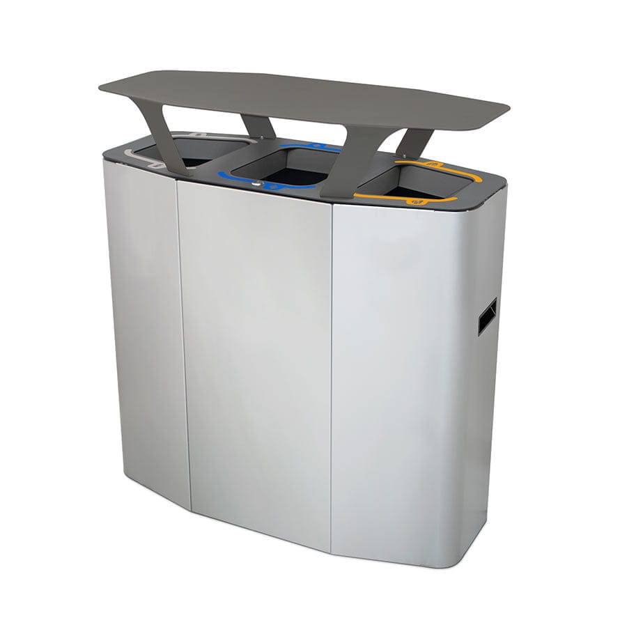 Hólfin eru skorðuð af með málmplötu. Hægt að hafa tvo, þrjú eða fjögur hólf. Tilvalin endurvinnslustöð. Hægt að setja þak yfir tunnurnar.